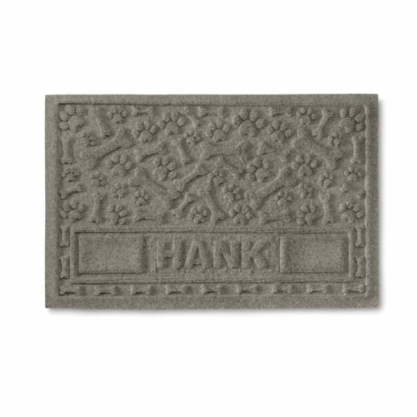 A playful paws-and-bones pattern and your dog’s name at the center of the design pack personality into this hardworking personalized Recycled Water Trapper pet placemat. Protect your floors from water damage, slobber, and crumbs with this placemat made of superstrong, commercial-grade polypropylene. Our thirsty indoor/outdoor Water Trapper mat boasts a tri-denier fiber system that traps water, dirt, and crumbs. The sturdy rubber backing holds the mat in place, keeping your dog’s bowls where they belong. And the unique border invites trapped water to drain quickly whenever you shake out the mat for easy cleaning. Personalize with up to 7 (18″ x 27.75″) or 9 (22.88″ x 35.5″) letters.