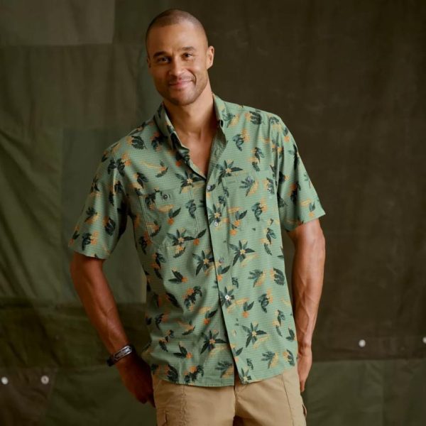 Hot weather calls for the cool comfort of our Tropic Tech Printed Short-Sleeved Shirt. Incredibly lightweight 2.8-oz stretch fabric made with recycled polyester moves with you, while the open weave provides built-in A/C for a button-up that can take the heat. Classic work shirt styling with dual button-close chest pockets—one with a pen/sunglasses holder—for performance that goes anywhere. Finished with a hidden sunglasses cleaner in the hem to keep your vision clear. Active Fit.