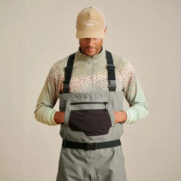 These Clearwater breathable fly-fishing waders for men are feature-rich and built with a Modern Fit to eliminate traditional bulk. Four-layer waterproof breathable nylon fabric is light yet durable, with a 30K Waterproofness/8K Breathability rating. Opposing side-release buckles allow for waist-high conversion on warm days. External storage pocket with stretch panel for small items and fly boxes, plus a kangaroo-style handwarmer pocket on the front chest. Anatomical neoprene booties with integrated neoprene gravel guards reduce water drag and collection. Low-profile seam construction and low-profile belt loops with 1½” webbing belt included. Hook and loop patch on interior pocket to attach Orvis waterproof pocket (8G3H sold separately).