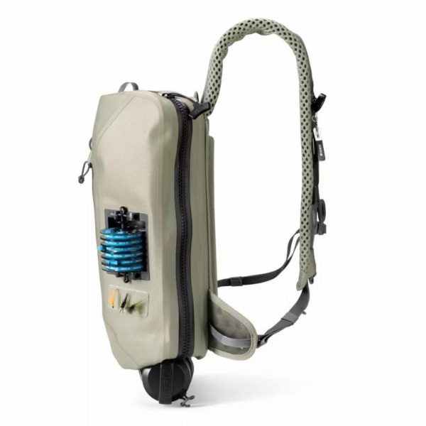 Constructed from 840-denier, abrasion- and puncture-resistant ballistic nylon and then coated with .1mm TPU on both sides of the fabric, the PRO Waterproof Sling 14L fishing bag is at the top of its class. At 14L of storage space capacity-wise, our PRO Waterproof Sling hits a sweet spot between our Guide Sling and standard Sling Pack with added protection from the elements. The intuitive product design puts your fishing tools and accessories exactly where you expect them to be. Naturally, the pack includes the wildly popular, patented, easy-access Tippet Whippet docking station, now welded onto the fabric instead of sewn in so there’s no possibility of water leakage. Also note the beefy, submersible, easy-slide, #10 TIZIP® MasterSeal zipper, as that one’s critical. With actual teeth that grab and seal, it prevents the dreaded blowout that plagues packs with a sandwich bag-style closure. Gear stays bone dry and access is easy thanks to a generous opening with an interior we’ve brightened up by adding a high-vis chartreuse color. We’ve also redesigned the shoulder strap and back panel with perforated 10mm foam padding, decreasing weight and bulk while allowing for better air circulation. In short, the days of the dreaded “misty back” are over. Deep dive into further features and you’ll find an integrated back panel net scabbard and exterior D-ring, a second, water-resistant accessory pocket with YKK AquaGuard® zipper, water bottle pocket with retention leash, and internal hanging pockets to keep gear organized. The shoulder straps even give you accessory docking stations in a dialed-up sling pack perfect for wet, nasty conditions. Weight 748g/1.65lbs.